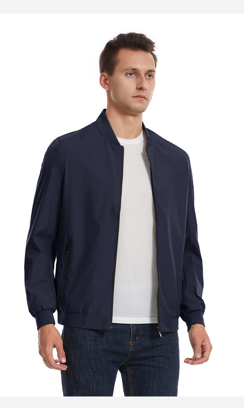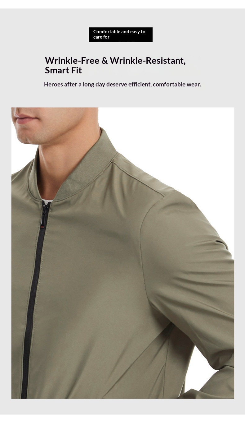 Boasting a wrinkle-free treatment, solid color design, stand collar, and zipper placket, this jacket is durable, lightweight, and easy to care for, perfect for busy lifestyles.